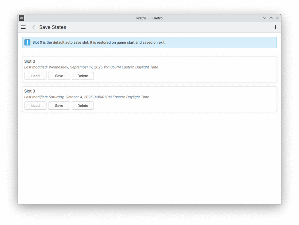 KRetro has a system for managing save states for each of your games, including a default save slot that automatically saves and restores your game progress when you quit and launch KRetro.
